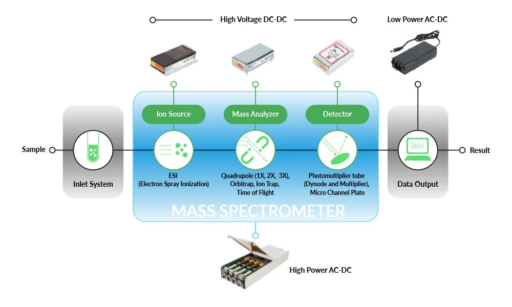 Accuracy and long-term reliability are key requirements for analytical instruments. From front-end configurable multi-output power supplies driving the whole instrument to the HV DC-DC converters powering the critical parts of the IP from ion source to detectors or the desktop power supplies powering the data acquisition system we have the solutions to your variety of needs in this market.