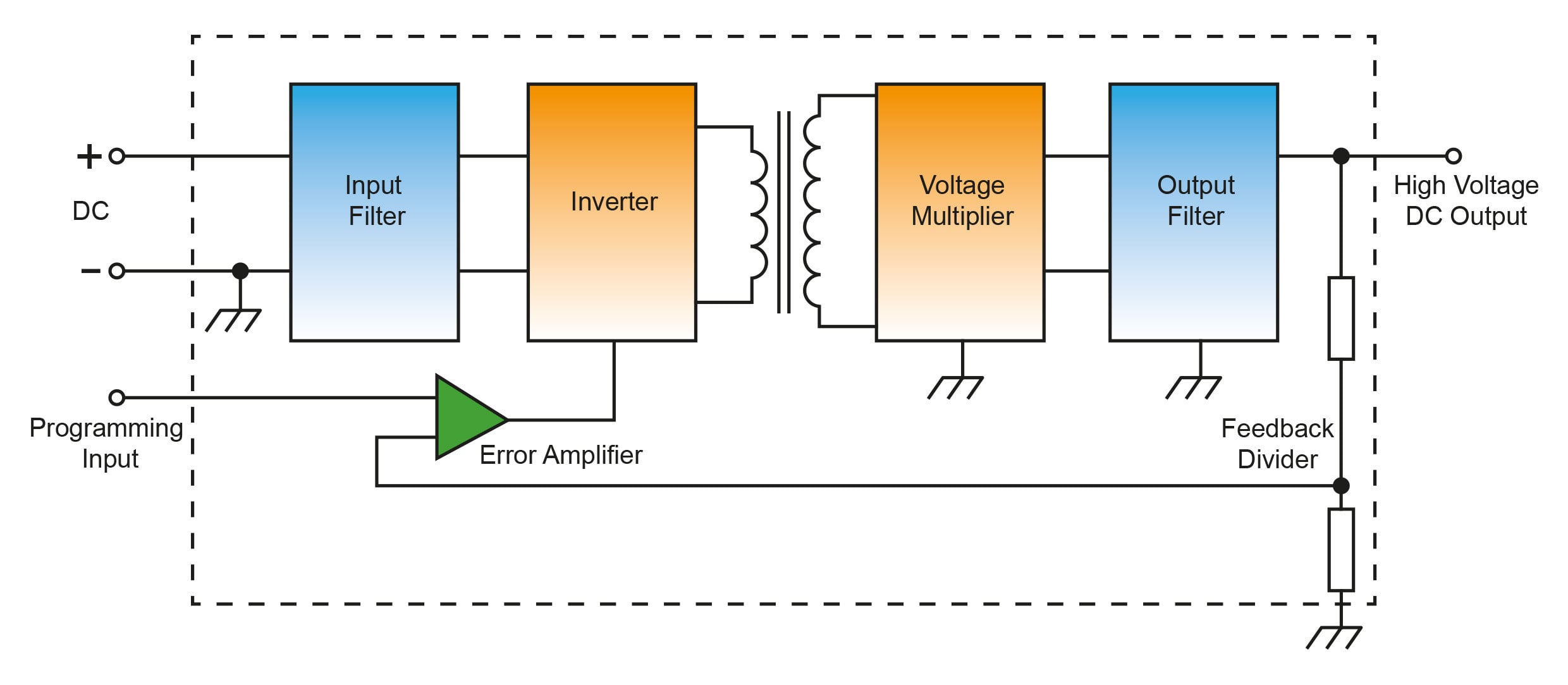 Fig 1: Component, high voltage DC-DC converters generate a high voltage output that is fully controllable using standard low voltage circuitry.