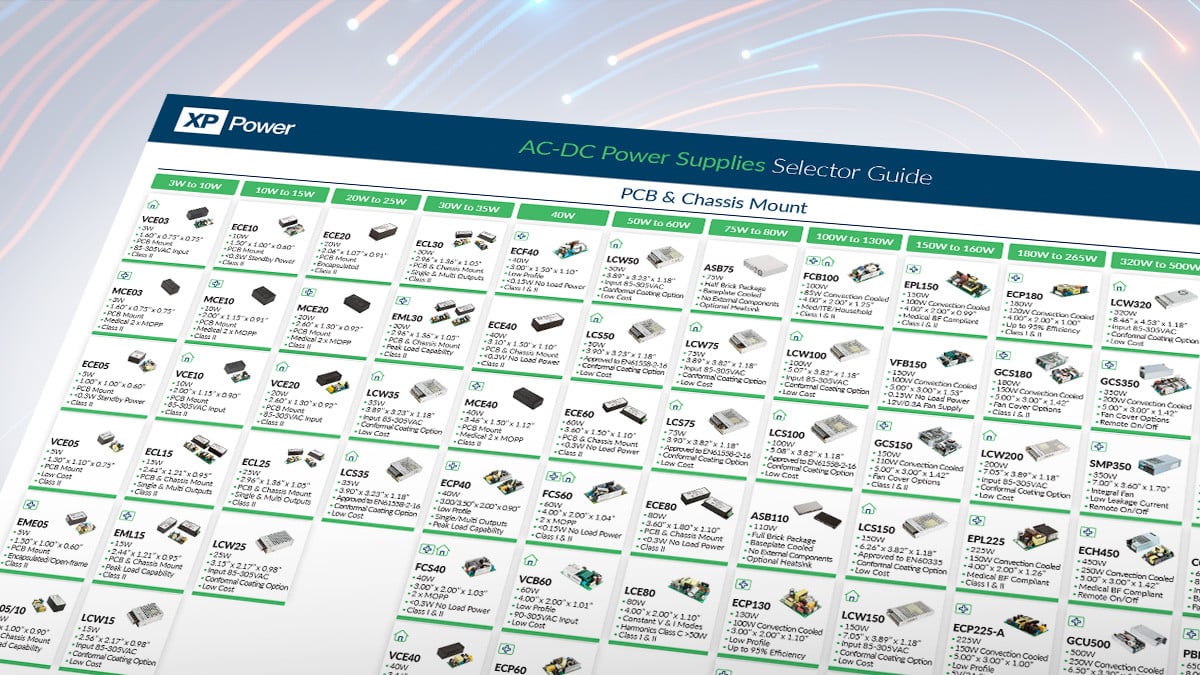 XP Power offers one of the world's widest ranges of AC-DC power supplies products. Download this invaluable guide for a quick reference and easy-to-follow graphical overview of our extensive product line.