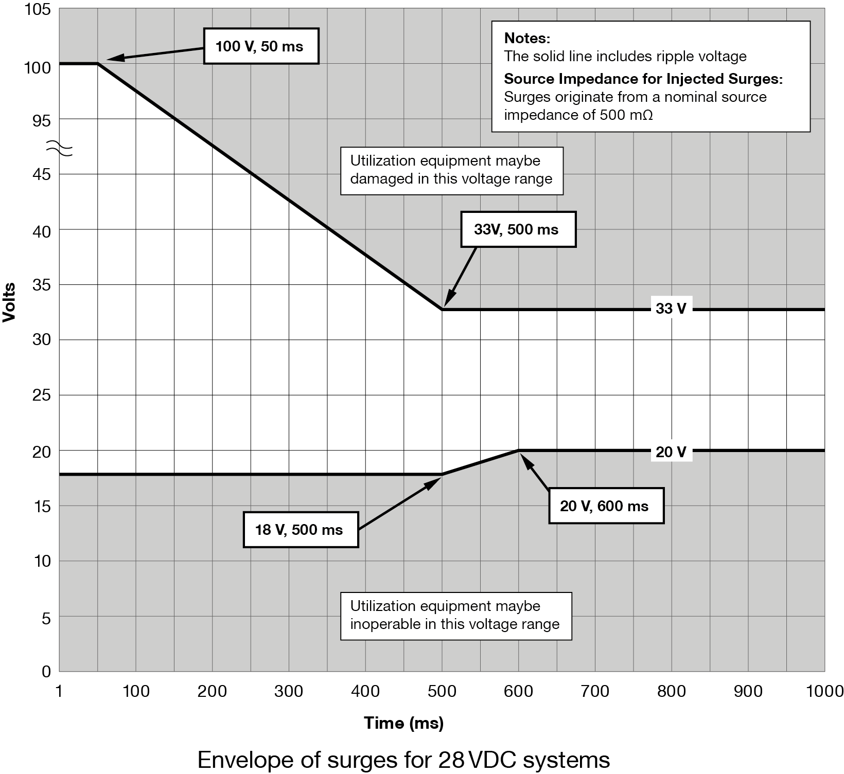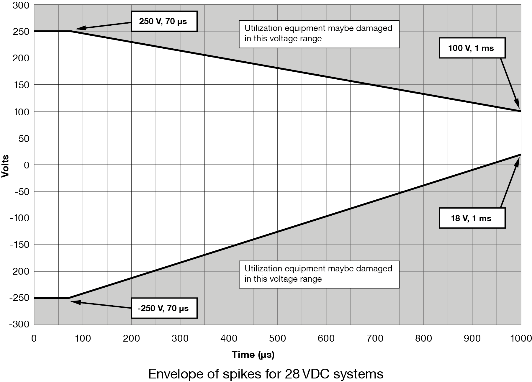 Below are the graphs which define transient surges and spikes for 28V nominal systems in normal and generator only operation mode.