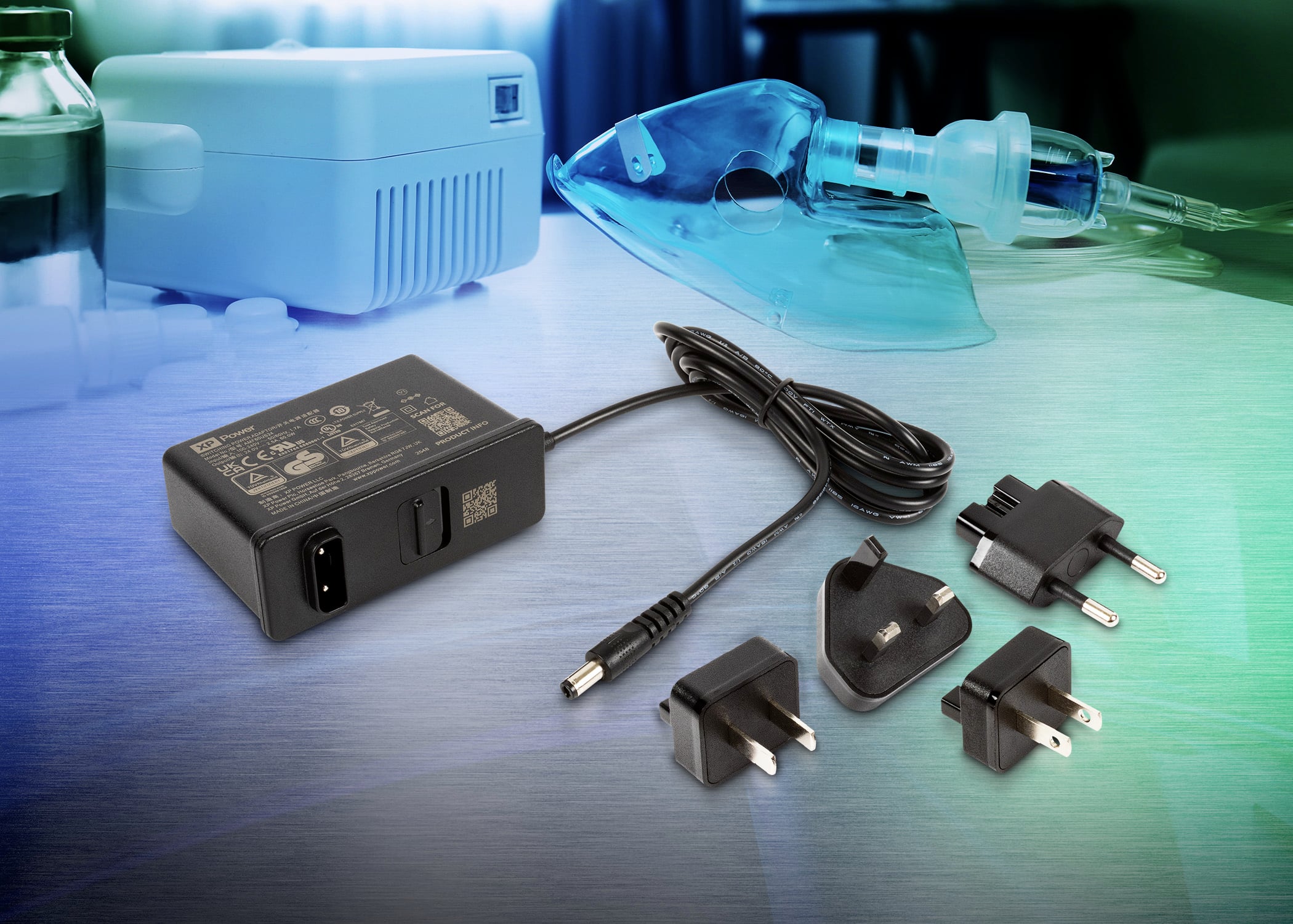 The series provides four output voltage models, 12V, 15V, 19V, and 24VDC, and is specifically designed for applications in respiratory care, patient monitoring, diagnostic equipment, imaging systems and test & measurement. A wide 80 to 264VAC input range supports global operation. Interchangeable AC input plugs for use in North America, Europe, the UK, and China are available, allowing a single platform to be used across regions; plugs can also be supplied separately to match regional requirements.